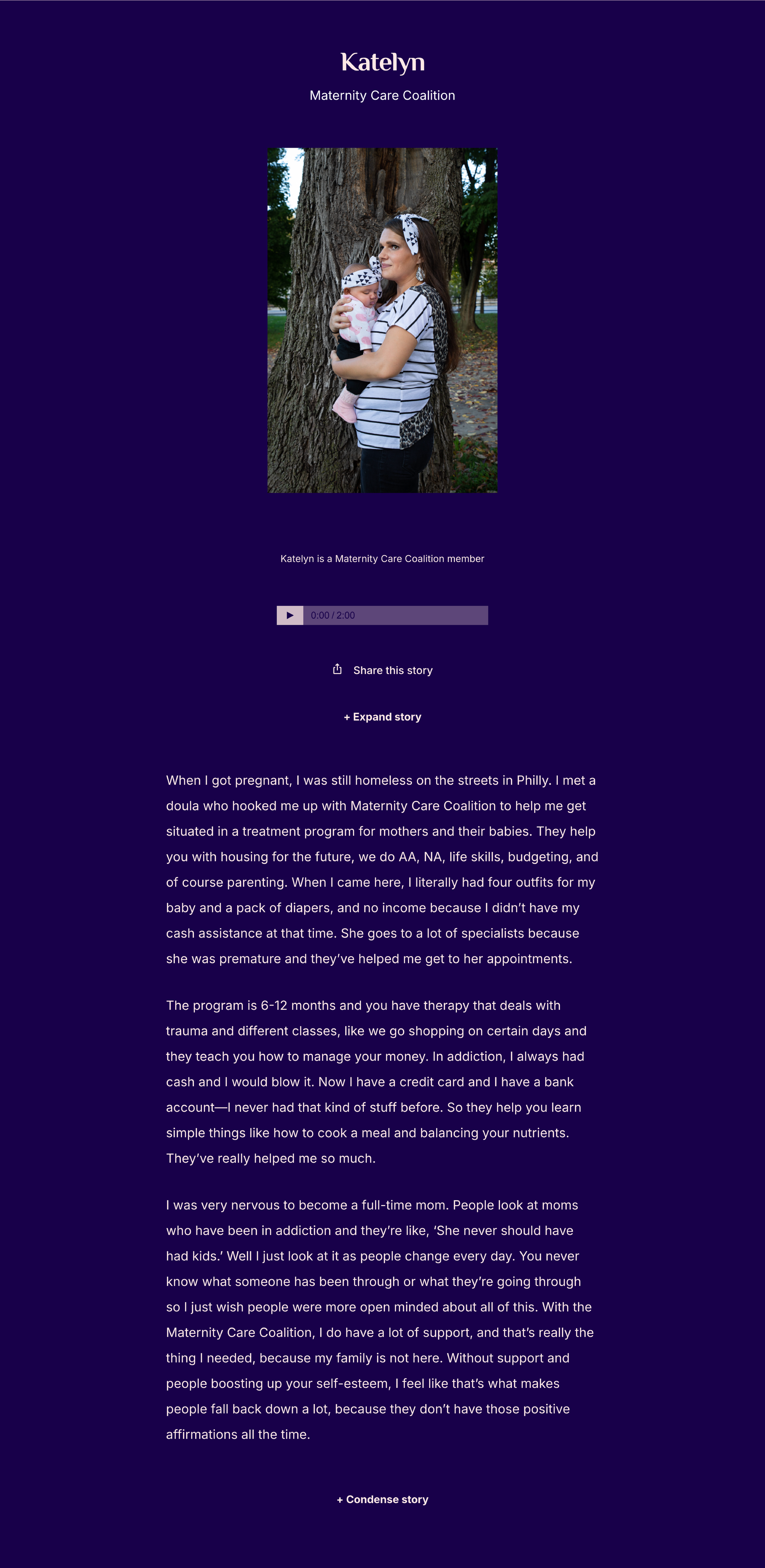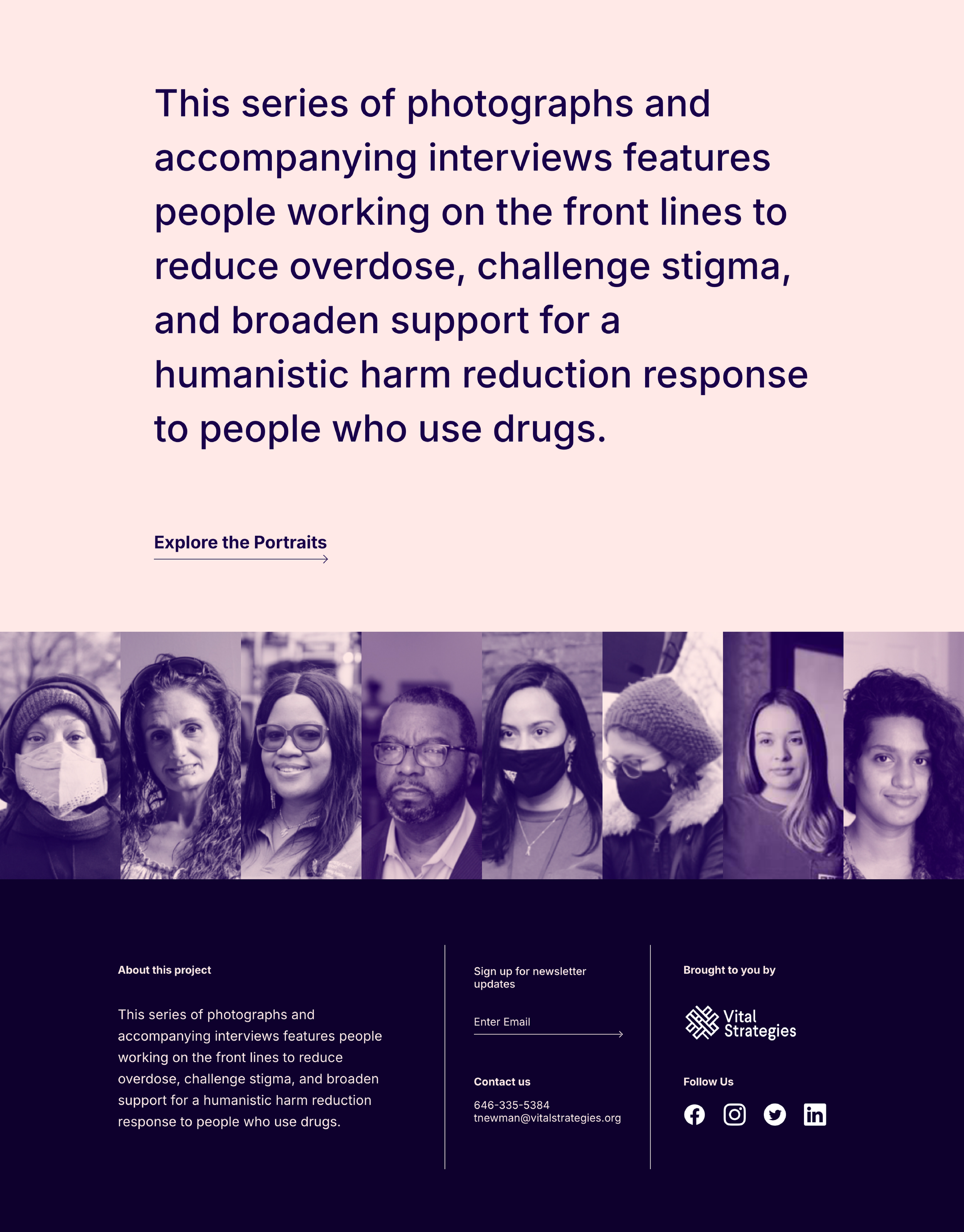 The Vital Strategies Overdose Prevention Program collected a series of photographs and interviews of people who are dealing with the current overdose crisis. Tasked with designing a website to house this collection, I developed a branding language to reflect the emotional tone conveyed through the stories.